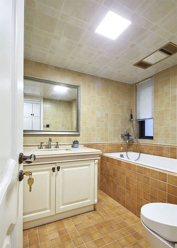 ▲浴室用暖黄色瓷砖铺设了地面,浅黄色做墙面,颜色上有递进性,浴缸本身就是干湿分区的一种手段,总体来说还是很不错的。