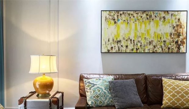 ▲客厅沙发背景墙上用一副长型油画装饰,颜色上做到了一致。