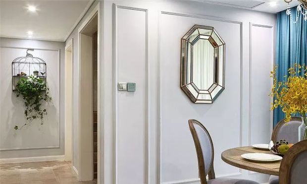 ▲餐厅背景墙上的平面镜的样式很有特点,复古上档次。
