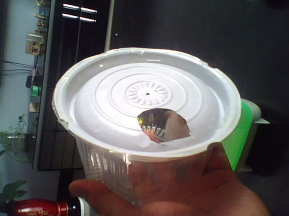 4.米桶里的勺子看到了没,用电烙铁把边缘烫出一个凹口,就可以做成食盆了哦,我还用厚的双面胶粘在了底部,这样不容易翻.要用厚的那种比较牢哦.