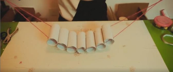 4、吊桥需要6个卷纸筒和绳子,在每个桶上打四个眼,眼要对称,用线穿过去,固定。