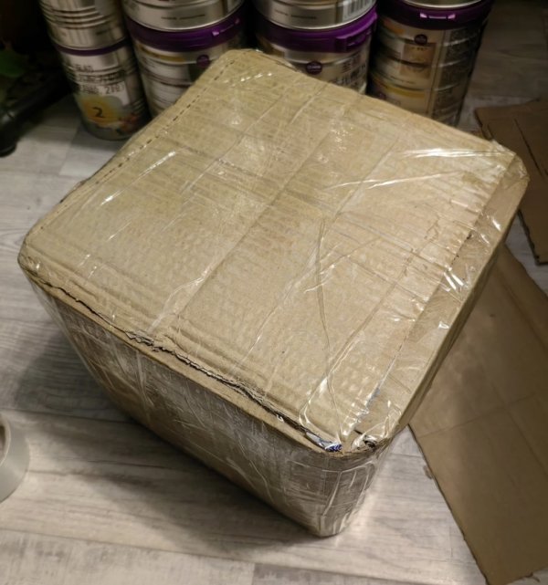 找个长宽高最好和这凳子半成品一样的废纸箱,可以直接放进去,省钱又省事,把纸箱本来的底和盖封住,再用透明胶封箱封住,要裹紧,整理好形状。