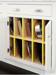 有些业主家厨房柜子多,抽屉少,其实在柜子里加几块板,储物效果也是能翻倍的,柜子又高又深不好收纳小物品,别担心,用9块木板将柜子隔成10个小空间。当然了,具体柜子内要隔开还得根据你放置的物品来决定,不管是平开式柜门还是抽拉式柜子,这种方法统统实用,关上柜门后就完全看不见了,东西还不会东倒西歪。