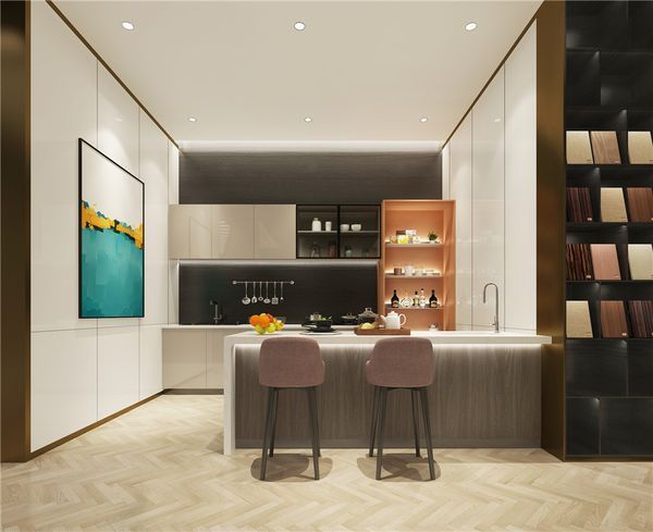 黑胡桃、樱桃木属于深色系,与半透灰白色调的混油饰面板结合,运用稳定的木结构工艺和新的油漆工艺,辅以石材、皮革、金属等元素,带来充满中西合璧的层次变化,软装搭配的加入则让这个系列的视觉温度保持刚刚好的平衡,清新淡雅、清凉有序,中西文化在此碰撞,融合,蜕变成轻奢、雅致的空间所在。