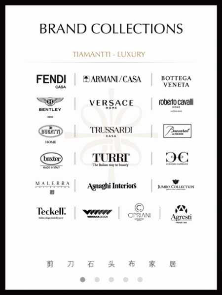 1.上海剪刀石头布知名家居卖场品牌 成立 1998 年,旗下高端品牌帝幔TIAMANTTI,甄选世界一线时尚家居品牌,如Fendi Casa、Bentley Home、Asnaghi Interiors、Visionnaire、Cornelio Cappellini等原厂原装进口。