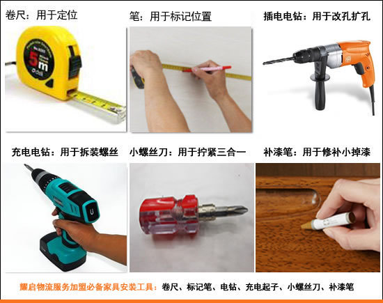 其它特殊工具如内六角螺杆一般家具出厂时都配有,自己长期安装家具还需要电钻改孔扩孔用的以及补漆笔用于小磕碰掉漆的修补,考验一个安装工是不是合格的不仅要看安装水平还要看对于小擦碰的维修水平因为家具是大件产品在物流运输中有小的擦碰的情况时有出现,只有做到小擦碰都处理的很好这样才能算是完美顾客最终才能满意。