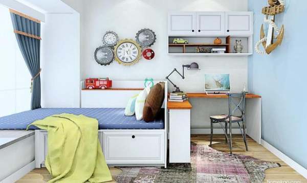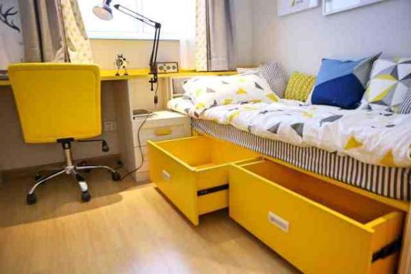 ▲飘窗拼接榻榻米,把原本放不下一张床的地方,挤出了一个床位和书桌位,孩子不仅可以用来睡觉,还能用来玩耍和学习,而且不碍地方哦~