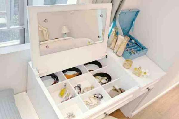 ▲合上是一张普通的桌子,翻开却是藏了一大堆化妆品的梳妆柜。老公如果再和你埋怨房间为啥不给他做个办公台,你可以理直气壮地说:别说我忽略你,我的梳妆台就是你的办公台!