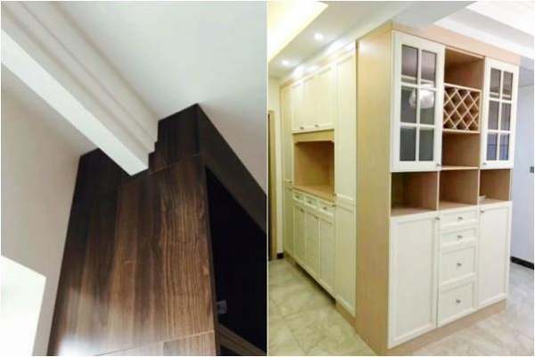 ▲房间顶部的房梁多,还有装饰的脚线,如果放成品的柜子,打扫的时候就知道有多累。还是做个省心的到顶柜子,把柜子和柱子融为一体,好看又不留缝隙,平时只用鸡毛掸扫表面的灰尘就行,何乐而不为?