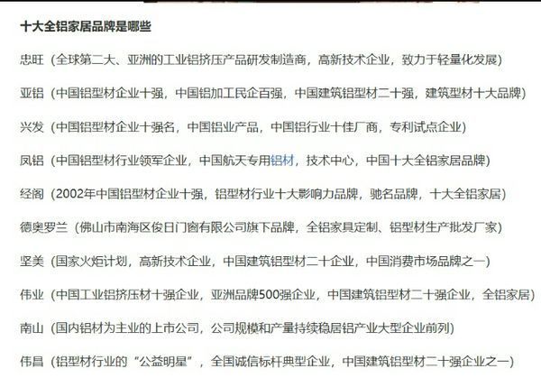 这是全铝家居十大品牌榜,产品各有特色,质量都很好,你可根据榜单再去实体店考察体验,只要你多跑多看多比较,一定能挑选到你家最适合的好产品,请采纳吧。