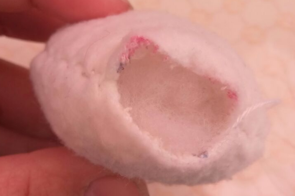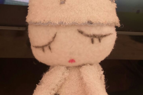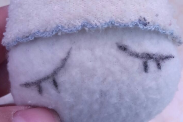 3、画出帽子的形状,裁剪缝合边缘,给娃娃戴上,用针线缝合,画出眼睛。
