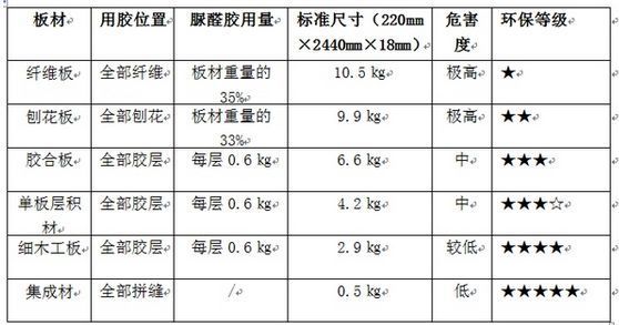 不同板材按生产时使用的用胶量,可以初步判断该类板材的环保性能,总体来说集成材和细木工板的环保性能是要比刨花板和纤维板好的多的。