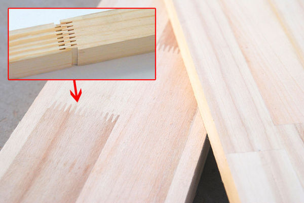 又名集成材,是指将窄、短的木条采用胶粘剂竖向接长(常用齿型连接),然后再横向拼宽、上下两面砂光而成的板材;由于竖向采用锯齿状接口,类似两手手指交叉对接,故又称指接板。