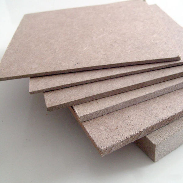 利用木屑及木材边角料,加粘合剂后压制而成。看刨花板的板材横截面是由三层组成的,外面两成是细的颗粒,中间一层的是比较大的颗粒。