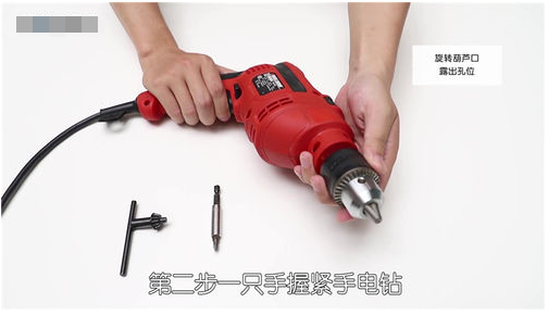 3、一只手握紧手电钻,手捏住手电钻的葫芦口用力旋转,让装钻头的孔位露出来。