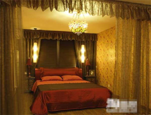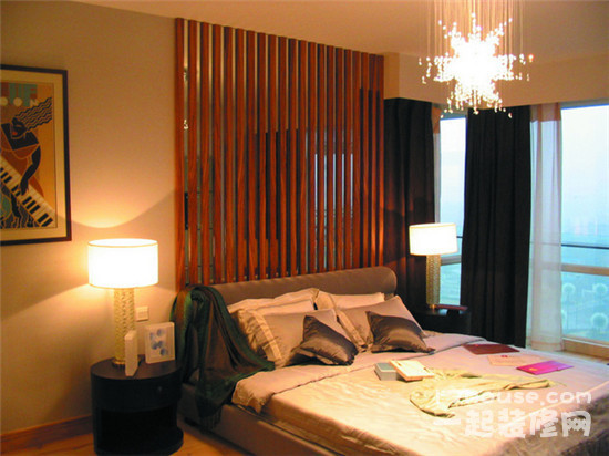 8、主卧室可选用了深木色。金色丝制布料结合光线的变化,创造出内敛谦卑的感觉。